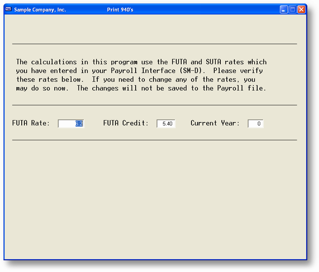 Form 940 is a payroll form submitted to the Federal government once a year. The form includes information about FUTA (Federal Unemployment Taxes) and SUTA (State Unemployment Taxes). The information for this form comes from the year's payroll data. If you have not been running payroll for the entire year you will need to supplement the information which appears on the screen with your prior totals.