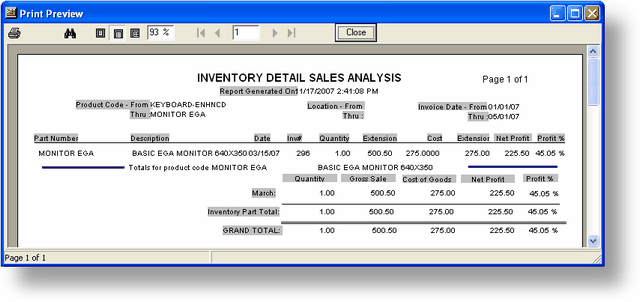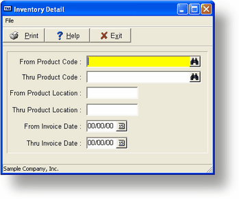 This program will print a report of Inventory detail. This is a detail report of Invoices that have been posted in the system. This report is sorted by Inventory Product Code. You can filter the report by inventory product code,inventory product location or invoice date range.
