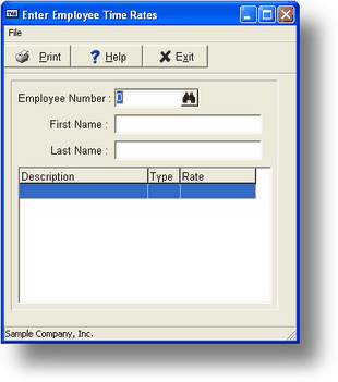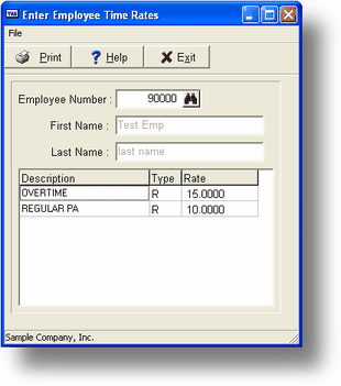 Use this program to enter or maintain a set of time card rates for a specific employee. An employee must have time card rates entered previously if you are going to record time card entries while making payroll entries in PR-B.