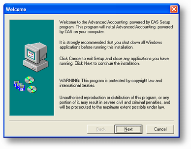 You will see a dialog box welcoming you to Advanced Accounting 7 powered by CAS. These are standard instructions, just follow as you would for any other Windows program.