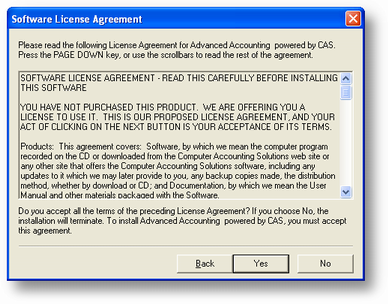 Click on the next button. The next dialog box contains the license for Advanced Accounting 7powered by CAS. Please read it carefully. If you click the Next button you have accepted the license and have agreed to be bound by it. Software License Agreement is displayed below.