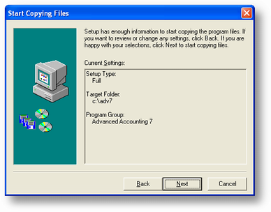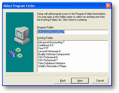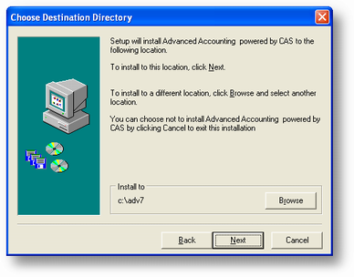 Next you will be asked for the folder (subdirectory) where Advanced Accounting 7 should be installed. Please read the section below that applies to you before choosing a directory: